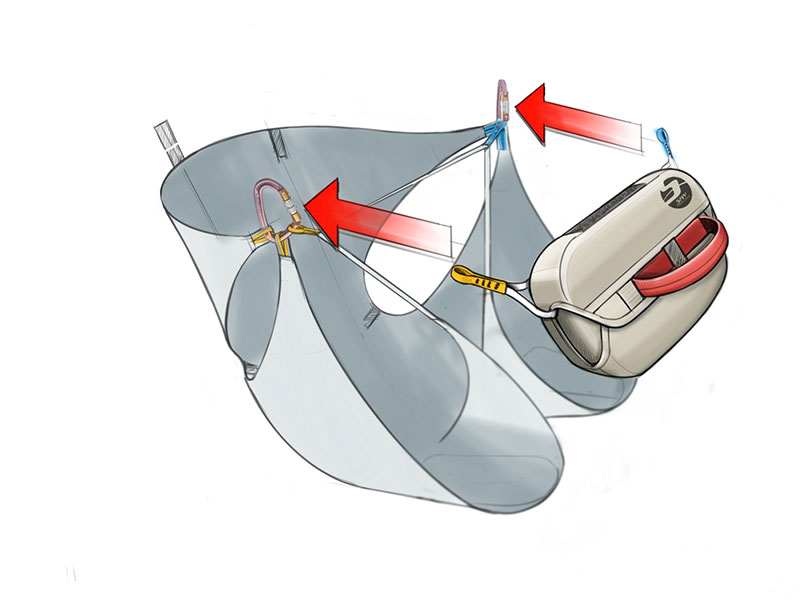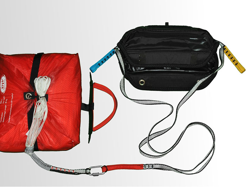 Wordt bevestigd aan de hoofdkarabiners en is geschikt voor lichte noodchutes.