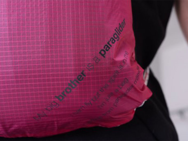 Voorzien van de Lifecycle-slogan “My big brother is a paraglider. I can’t fly but the spirit is in me…”
